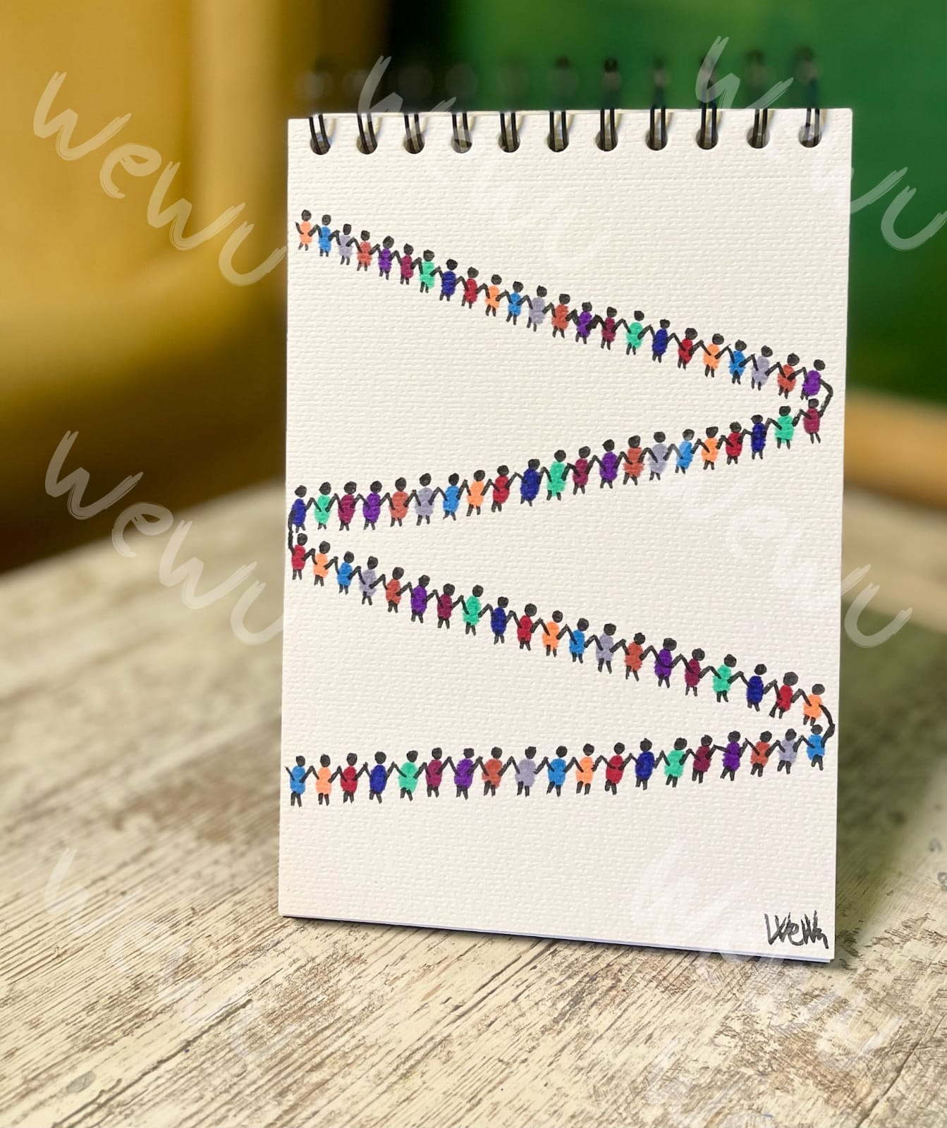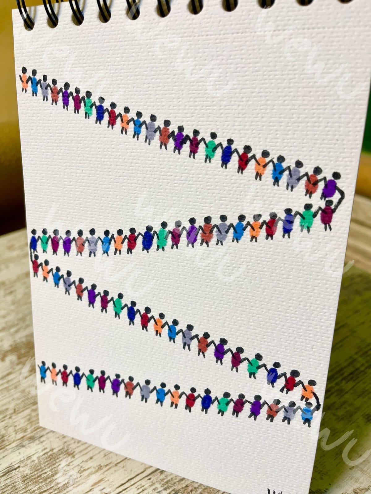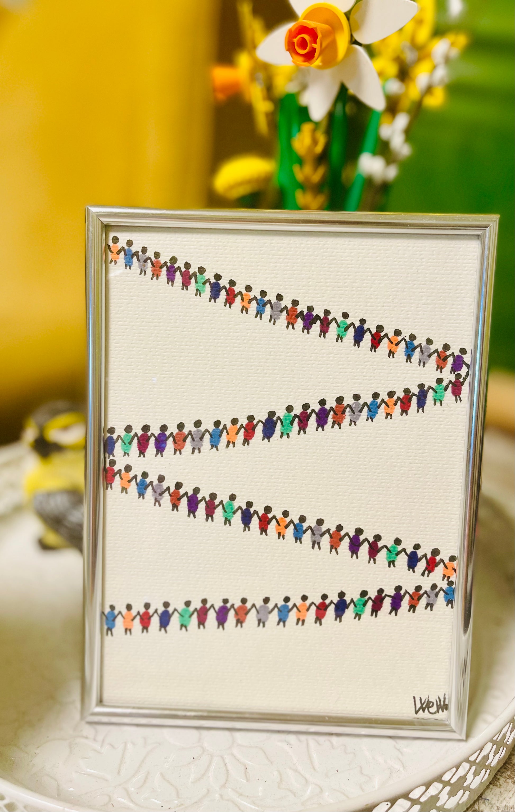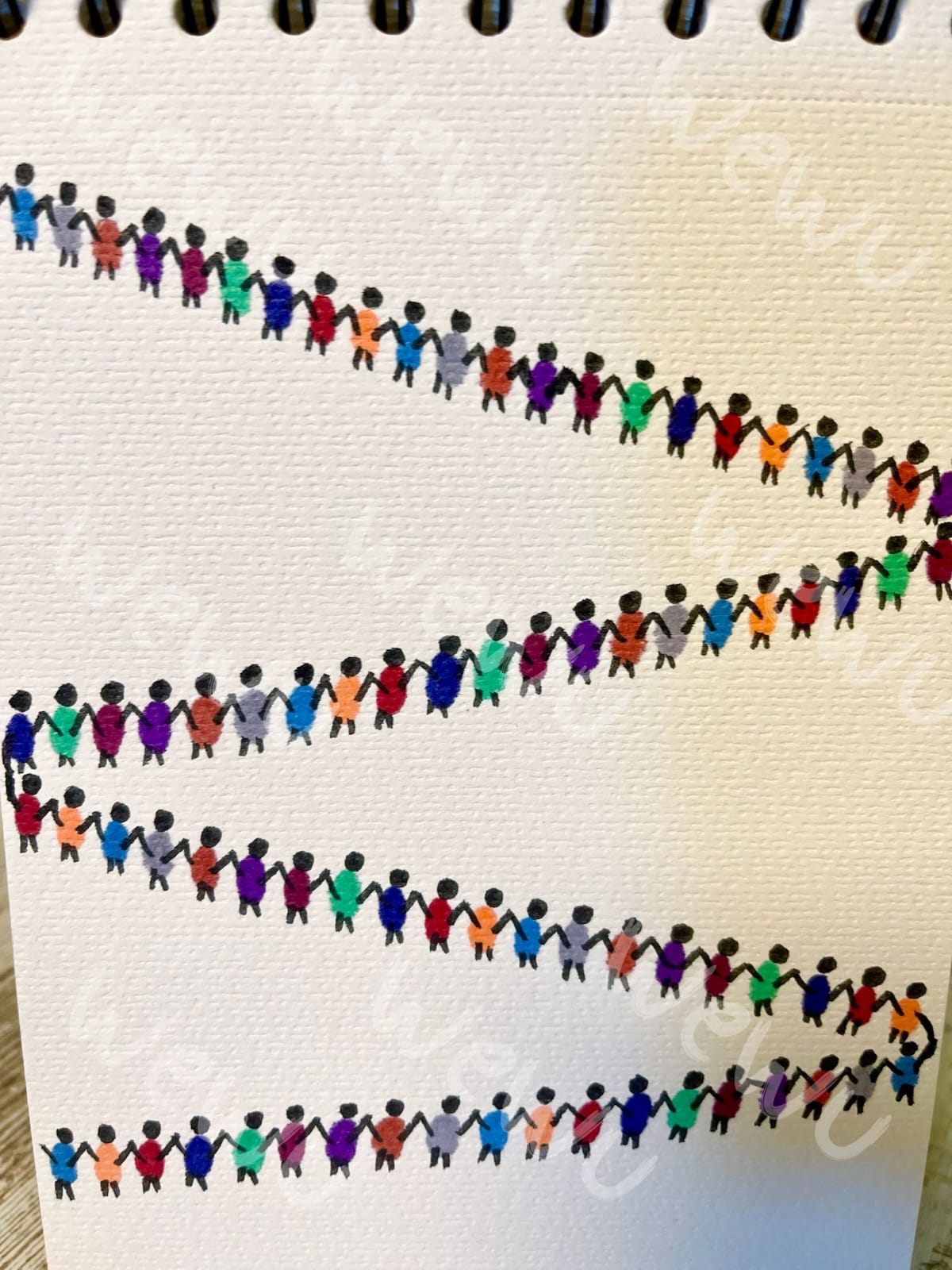 This unique hand-drawn felt-tip artwork symbolizes human connection and community. The lines are made up of tiny, colorful figures holding hands. The vibrant colors and playful shapes express diversity, unity, and harmony.