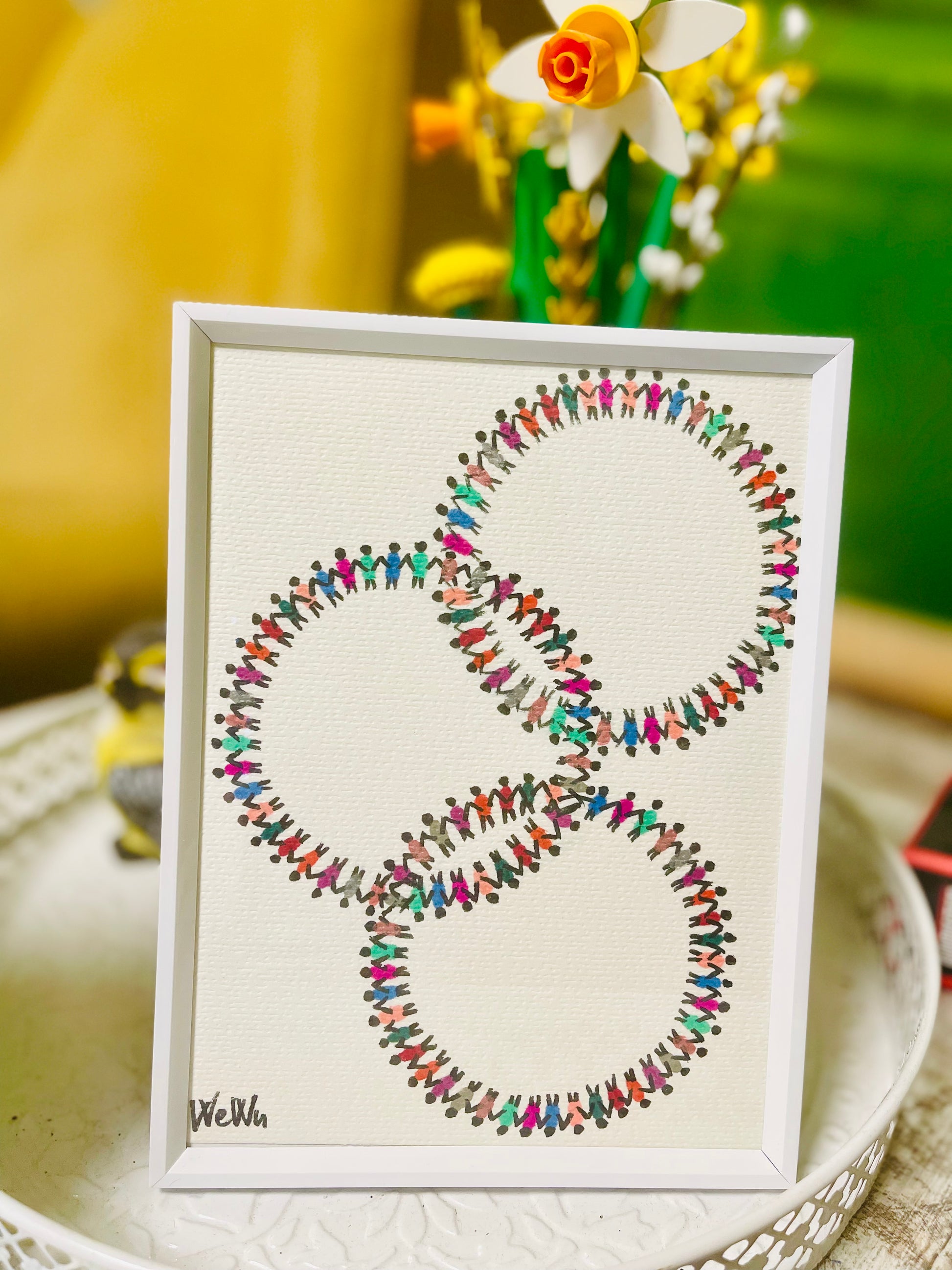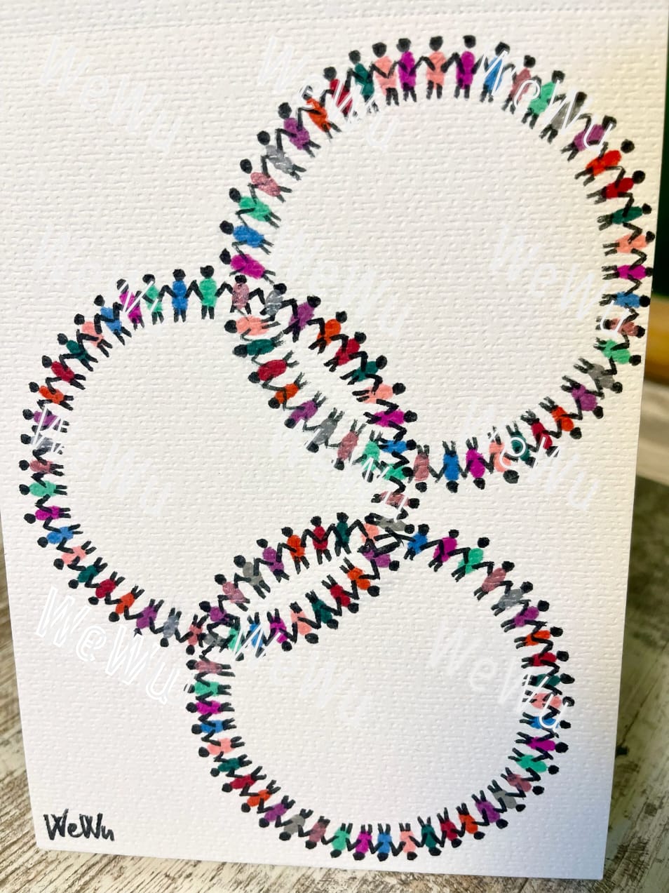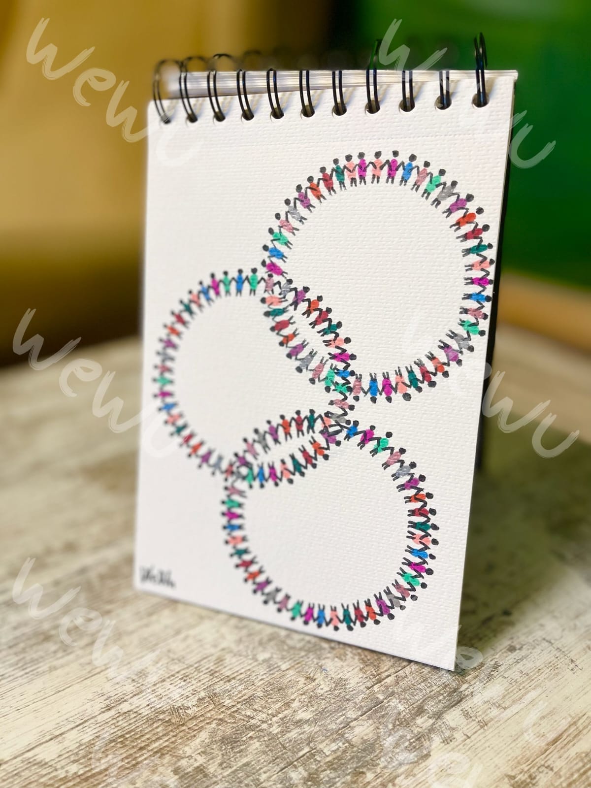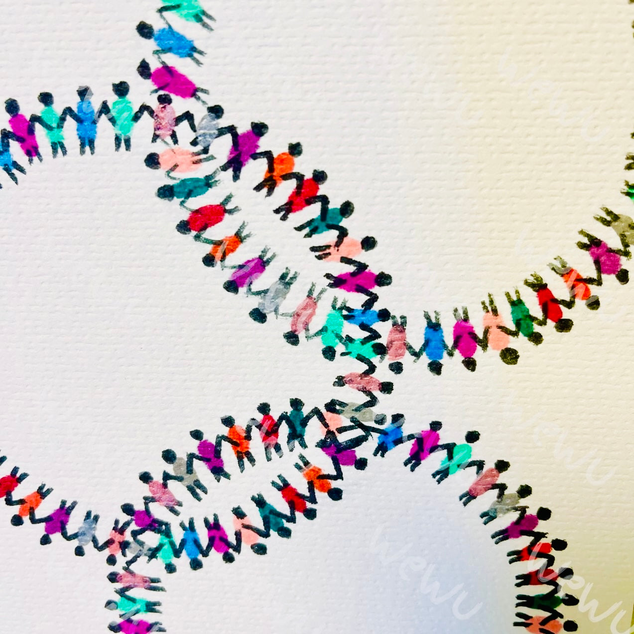This unique hand-drawn felt-tip artwork symbolizes human connection and community. The three interwoven circles are made up of tiny, colorful figures holding hands. The vibrant colors and playful shapes express diversity, unity, and harmony.